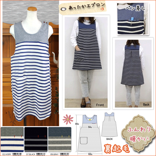 【送料無料メール便】冬用厚手生地♪裏起毛 エプロンボーダー柄 肩ボタン <アイボリー・ブラック・グレー>【ポケット/ペン差し/防寒/暖かい/保育士/介護士/かわいい/おしゃれ/シンプル/お尻が隠れる】